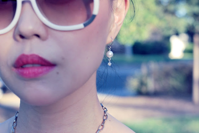 For a glam look that's refined enough to wear to work, I added a statement necklace to compensate for the mildly low neckline, a velvet sequined belt, minimal arm candy, and work size handbag. My oversized round shaped Chloe glasses and conservative hair bun kept the Jackie O influence heavily intact. Although I opted to wear grecian sandals, you can definitely pump up the refinement by wearing a pair of closed toe pumps.