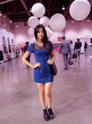 The above is a long-winded explanation of why I wore yet another dress at MAGIC. My schedule at the fashion trade show was jam packed with panels, meetings, dinners, parties, and blogging. Every day, I woke up with a million things on my mind while simultaneously trying to do a million things at once. I perfected the skill of teeth brushing while texting AND doing thigh lunges. Needless to say, I didn't have much time to focus on what to wear. That's why I love my Lovemarks dress. Its shape and length is so me as the puff sleeves and baby doll cut cutely highlights the female body. The brocade stretch fabric mixed with a sheer panel adds a dressy versatilility to the outfit, making it quick and easy to switch from day to night with just a few key accessories.